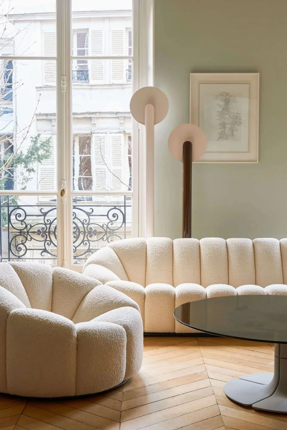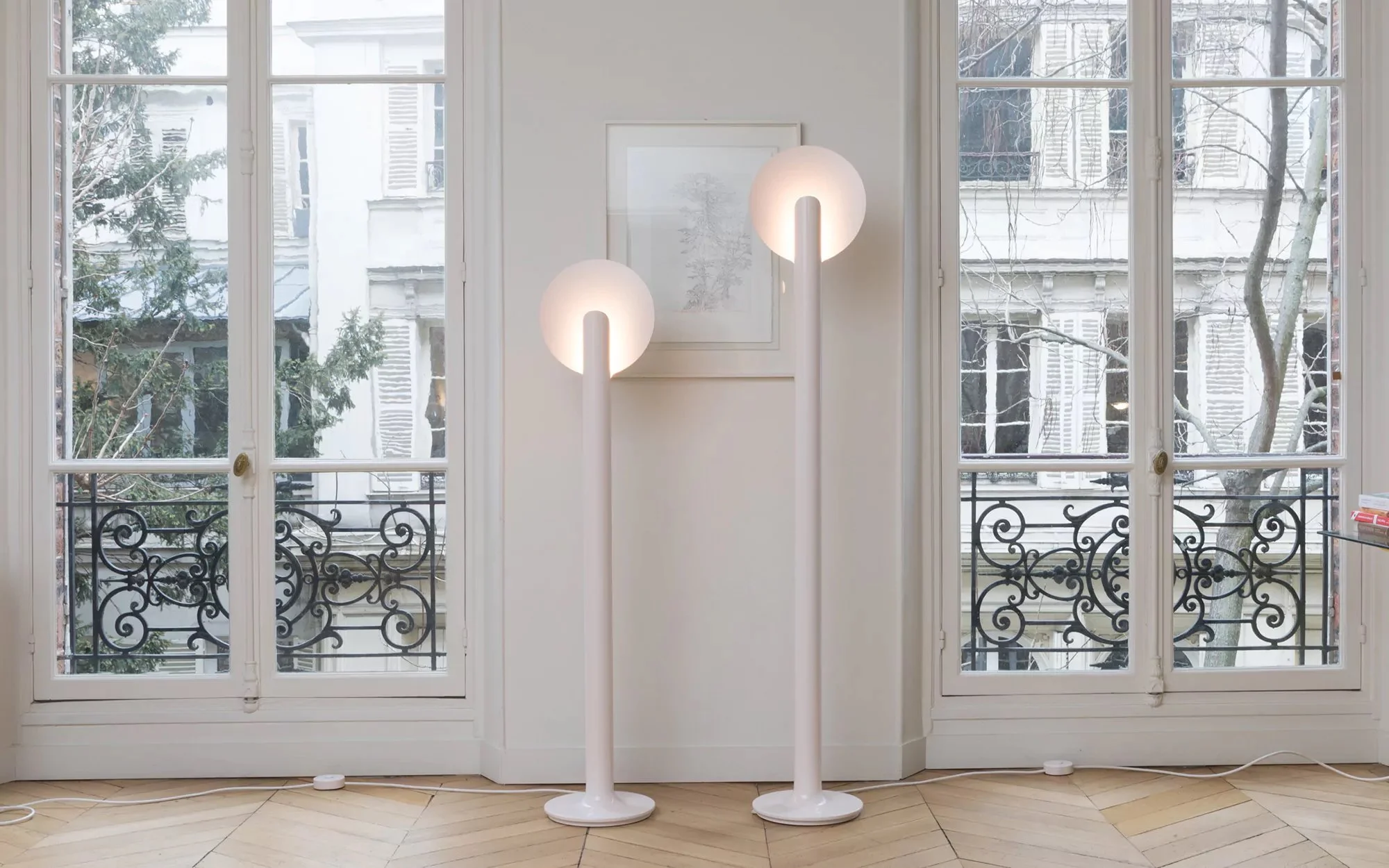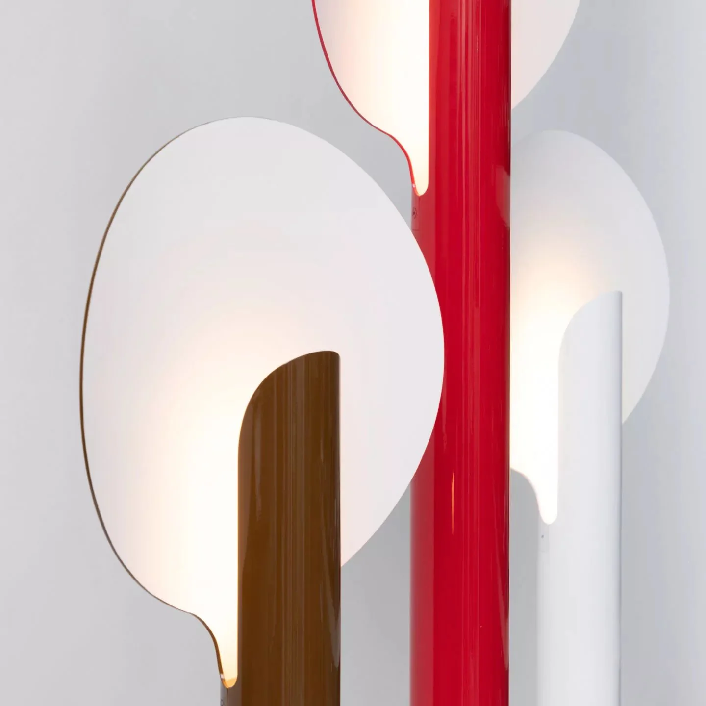 엘리제 조명은 매끈한 알루미늄 기둥이 솟아오르다 꼭대기에서 두 갈래의 곡선으로 나뉜다. 한쪽은 유기적인 컷으로 마무리되며 전구를 감싸는 형태로 남고, 다른 한쪽은 둥근 오목 접시 모양의 반사판으로 펼쳐진다. 반사판에 닿아 부드럽고 은은하게 퍼지는 빛은 각진 곳 하나 없이 둥글둥글한 인테리어 디자인 콘셉트와 완벽하게 어우러지며, 공간에 차분하고 친밀한 분위기를 불어넣는다. 무광의 반사판과 대비되는 광택 있는 기둥의 마감은 세련미를 더하며, 당시에 유행하던 스페이스 에이지 space age 스타일을 연상시키기도 한다. 이런 점에서 미니멀하고 부드러운 형태, 그리고 기능성을 중시하는 폴랑의 스타일이 느껴진다.